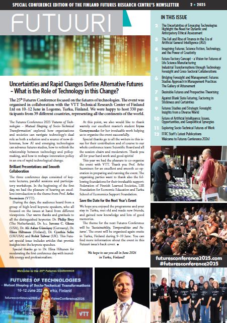 The 25th Futures Conference focused on the futures of technologies. The event was organised in collaboration with the VTT Technical Research Center of Finland Ltd on 10–12 June in Logomo, Turku, Finland.